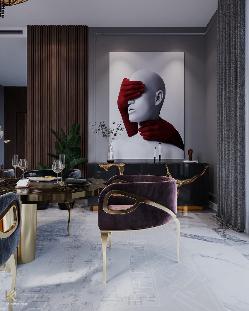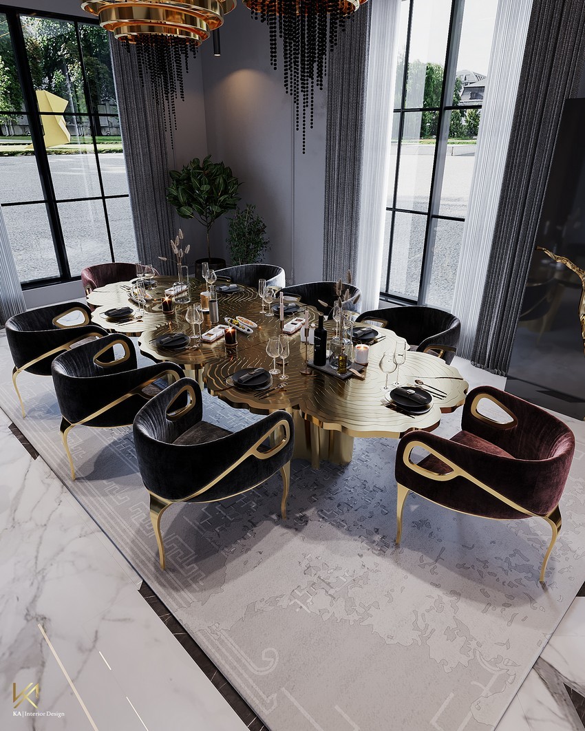 High-ceilings provide this modern classic dining room on a grandiose scale, leaving room for every masterful piece to breathe. A very contemporary feel of the decoration, using mostly monochromatic tones on the finishes and the fabrics, leaving the gold to crack over the aesthetic of the room to ultimately become the epitome of luxury to this project. The massive Fortuna Dining Table is an eye-catching piece for this space, culminating and embodying the same earthly-inspired elements used in the living room, creating a cohesive and deluxe look.