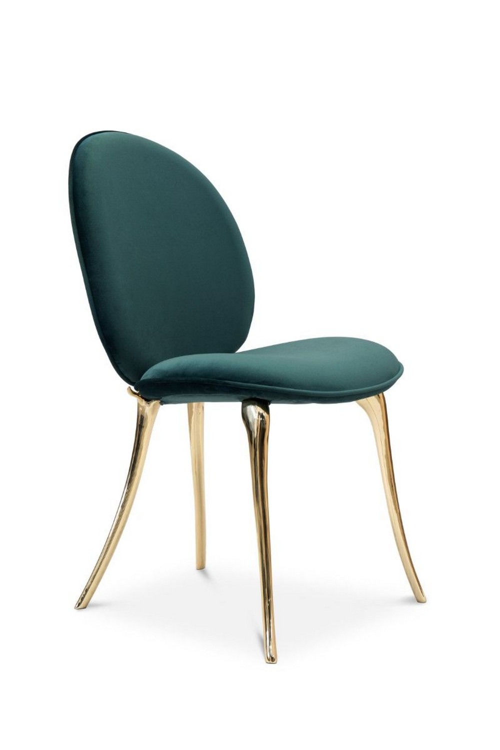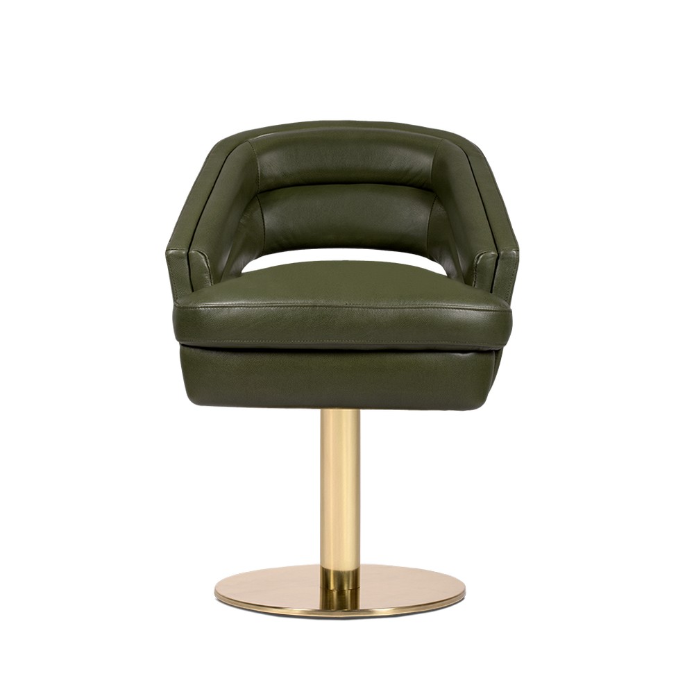 Russel is a dining chair with a round polished brass base and the timeless seductive velvet layered over a comfy foam frame. Extremely sculptural, it features an open back and deep horizontal tufting, both on seat and back. Definitely, a mix between mid-century aesthetics with a contemporary twist.