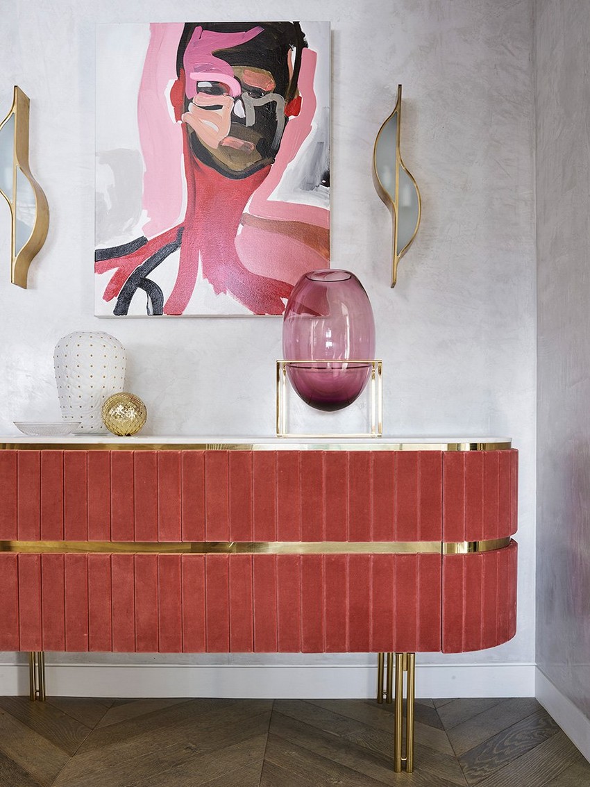 Sideboards are usually made out of wood. Edith is not and that’s why it is a distinctive piece to furnish your living room. It is upholstered with soft velvet and stands out for its high-end look at the top, making use of a grey textured marble. Available in several colors.
