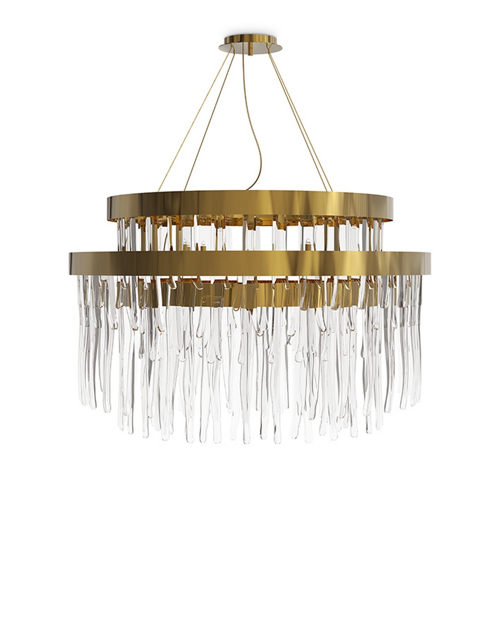 The circular gold plated brass levels of the Babel suspension lamp brings elegance to any luxurious ambiance. The exclusive uneven shape of each crystal glass made by the craftsman’s exceptional know-how creates a unique pattern of lighting refraction. An impressive object of desire.