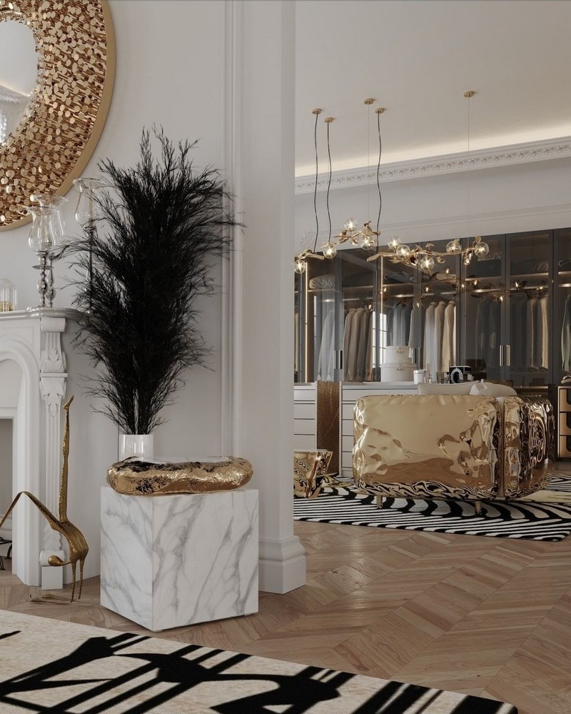 In this walk-in closet, bold square rugs stand out, which are also comfortable rugs, those that welcome us at the beginning and end of the day. In addition to the storage, a modern single sofa in golden tones is highlighted, a bold design piece with an artistic touch. Right at the entrance, a marble side table completes the daring ensemble.