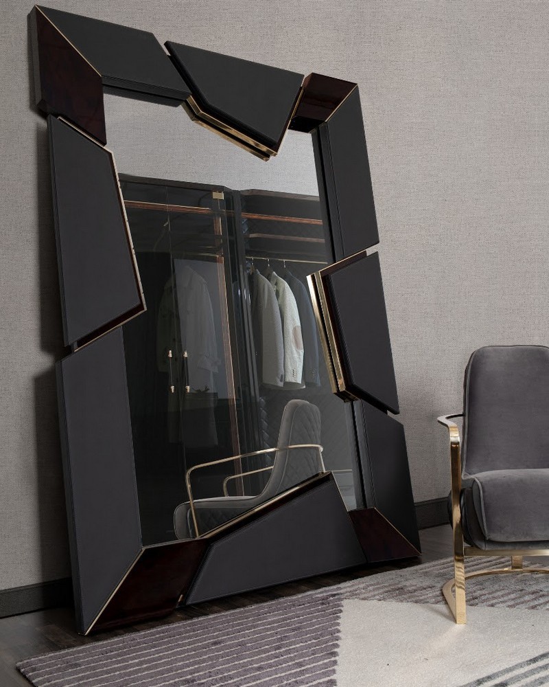 A full-length mirror is a must-have in any walk-in closet, and in here it’s perfectly combined with a design rug and an upholstered modern chair.