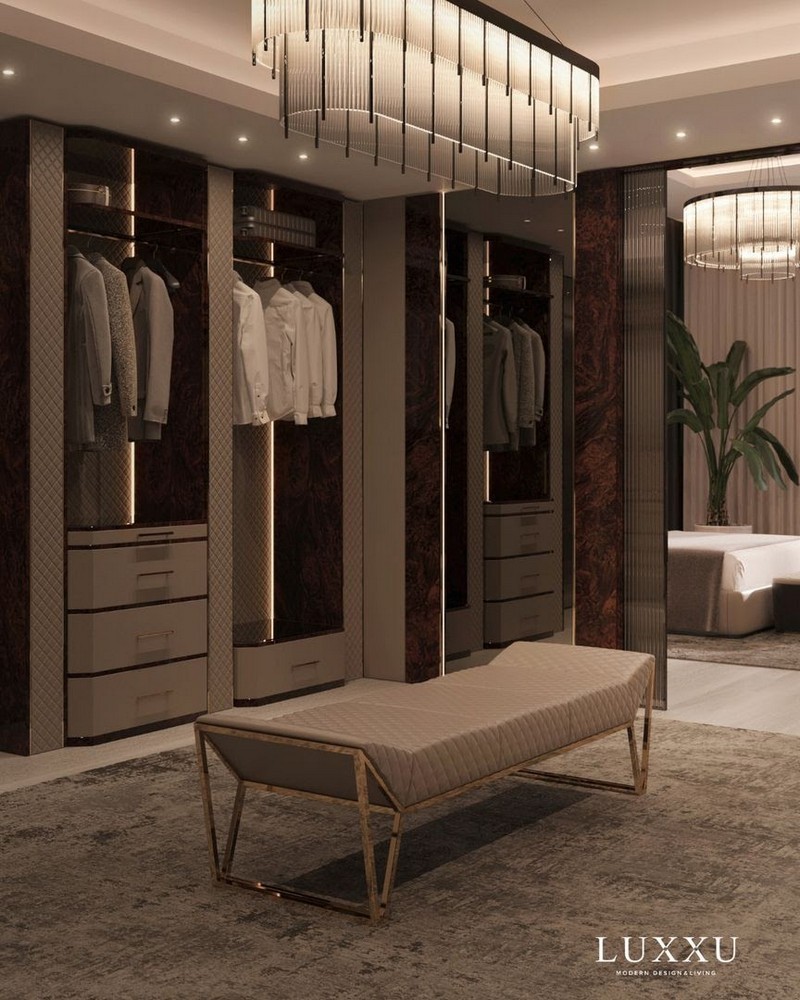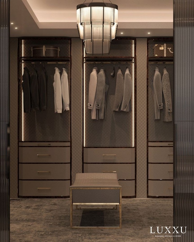 Again this modern closet allows us to see how the neutral tones can easily be combined with golden details and give a touch of luxury to the walk-in closet, besides the light that this closed space needs. Here you can also see the modern bench and the chandelier.