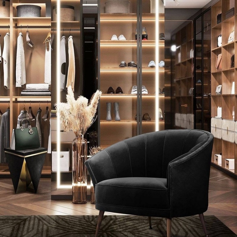 In this option, we find a modern walk-in closet, where once again a design rug gives comfort and unity to space. The black upholstered armchair blends perfectly with the modern side table.