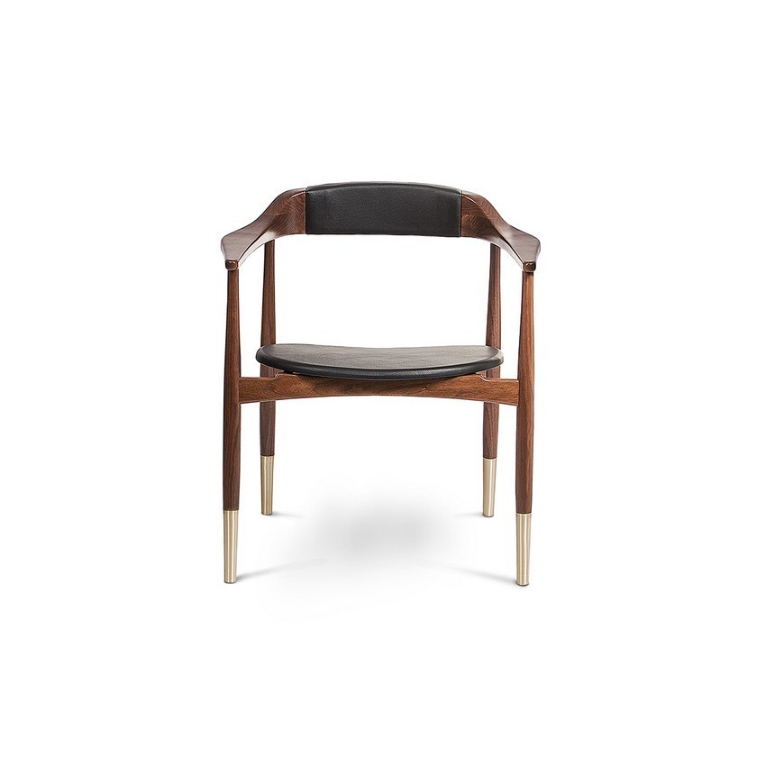 Perry is a dining chair inspired by the most famous occasional designs – it features a body structure produced in solid walnut wood, which makes it a durable and solid chair. Both the seat and the back cushions are upholstered in leather, evoking a sober look that contrasts with metal shoes on its legs, made of polished brass. A mid-century masterpiece and an homage to the modern living era.
