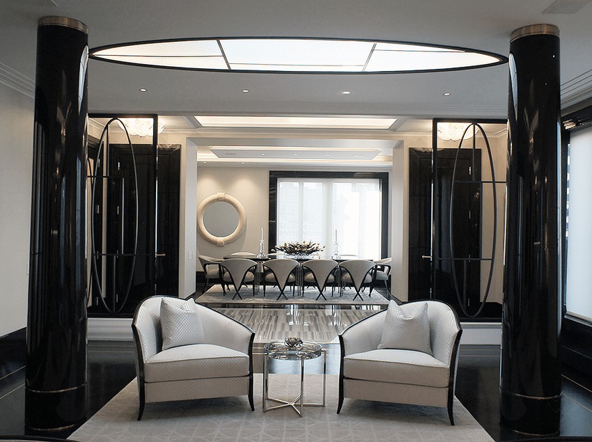 This 3,000 square foot penthouse crowns a classic Park Avenue prewar building. It was fully renovated as an elegant pied de terre, styled and configured for entertaining. Hand-crafted elements of lacquer doors and trim, brass floor inlay, onyx slab with book matched anagre linear fireplace and custom interior furniture, lighting and finishes result in a sophisticated air to a unique loft-like environment.