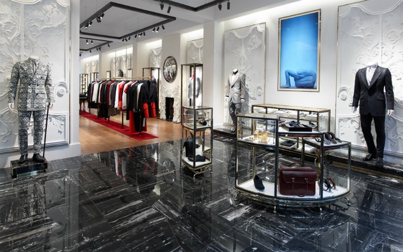 The David Collins Studio designed Alexander McQueen menswear flagship store opened in October 2012 at 9 Savile Row and is 210 square meters. The store is part of the ongoing global collaboration between the studio and Sarah Burton, creative director of Alexander McQueen (Kering). The space has been designed with a gallery aesthetic, retaining the original parquet flooring and framing the intricate plaster panels as artworks on the walls of the store. The rear of the store features a glass cube installation that is curated by Sadie Coles HQ.