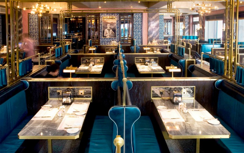 BBR is a brasserie inspired by the romance of early 20th-century travel, the idea of the train éclair de luxe, by the wagon-lits, and by the grand brasseries and hotels of central Europe. The brand insignia, designed by David Collins studio, has been incorporated throughout the design. Using finishes including marbles, terrazzo and custom ikat and kaleidoscopic wallpapers, a fin de siècle world has been created. BBR is the recipient of Best Booth Award (Wallpaper*) and Best New Design (Time Out).
